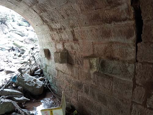 拱涵高5.6米,跨徑2.9米,總長10.2米,結(jié)構(gòu)為漿砌條石。因修建年代久遠(yuǎn),且后期道路于涵頂處加高,加上拱涵排水不暢和日益增多的重型車輛通行導(dǎo)致兩座拱涵出現(xiàn)縱向貫通裂縫、拱頂側(cè)墻外移錯(cuò)位等病害。拱涵進(jìn)出口端采用30cm厚鋼筋混凝土面層,并設(shè)置Φ32拉桿對(duì)拱涵側(cè)墻進(jìn)行加固,采用25cm厚鋼筋混凝土內(nèi)襯套拱對(duì)涵體進(jìn)行補(bǔ)強(qiáng)處理。