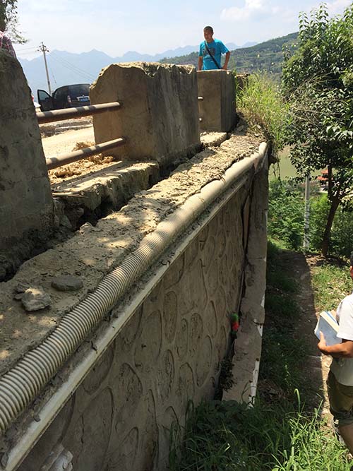 奉節(jié)詩城西路人行道加寬工程需在既有路肩擋墻外側(cè)增設(shè)2.5m寬人行道,原路肩擋墻采用漿砌片石砌筑,存在抗滑移、抗傾覆安全儲(chǔ)備不足等問題,加寬需考慮擋墻安全性綜合處置。具體處置方案為:加固擋墻后墻頂增設(shè)挑梁外挑人行道。