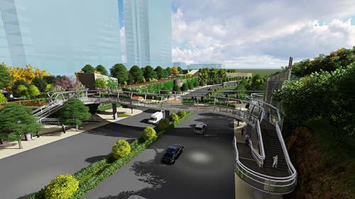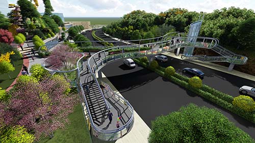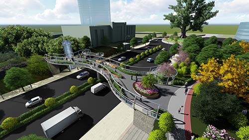 渝北區(qū)耍壩地下停車庫至盤溪河濱公園上跨人行天橋?yàn)楫愋弯摻Y(jié)構(gòu)人行天橋,橋面全寬6~11米,全橋共設(shè)置1個梯道,梯道全寬2.6米,凈寬2.3米,橋面設(shè)置1%的單向縱坡。天橋主梁為連續(xù)鋼箱梁,梁跨徑布置為17+19+7米,主梁梁高1.1米,箱梁頂寬6~11米,底寬4~9米。梯道梁高0.3米,寬0.6米,天橋主梁、梯道梁均為鋼結(jié)構(gòu),由鋼板焊接組合而成。下部結(jié)構(gòu)采用圓柱式及變寬度花瓶式扁型墩,基礎(chǔ)為樁基礎(chǔ)。