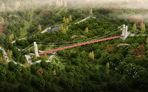 為打造市民休閑娛樂勝地,新建重慶市渝北區(qū)玉峰山——玉峰山森林公園段臨崖步道,步道中包含2座人行景觀索橋,分別為“鎖心橋”和“神閑橋”。鎖心橋跨徑50m,采用仿古設計風格,結構采用柔性懸?guī)?;神閑橋跨徑60m,采用現代常規(guī)懸索橋設計風格。