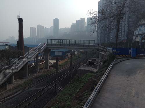 九龍坡核心區(qū)綠道二期項目鐵路跨線橋工程在重慶市九龍坡區(qū)龍鳳寺至大件碼頭段,貫通以“濱江人文風情”為主題的綠道工程,以達到完善該段綠道專屬健身、休閑、生態(tài)綠道網的目的。橋面寬度3m,橋下凈高9.7m,距鐵路中線凈寬3.6m,橋跨20m,兩端由人行梯步連接,橫斷面布置為0.25m(欄桿)+2.5m(人行道)+0.25m(欄桿),橋面鋪裝采用20mm厚毛面花崗巖+100mm厚C40鋼筋混凝土層。